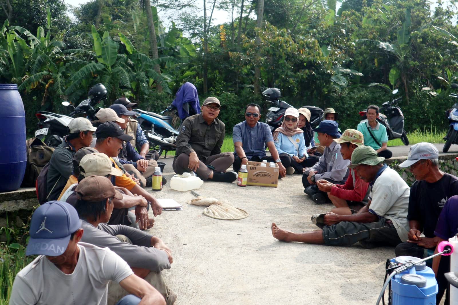Langkah penanganan tidak hanya difokuskan pada aspek teknis di lapangan, tetapi juga melibatkan pendekatan langsung kepada para petani. Kepala Dinas Ketahanan Pangan dan Pertanian Kabupaten Kuningan, Dr. Wahyu Hidayah, M.Si., turut turun ke sawah, berdialog dengan petani sambil duduk di pematang untuk menyampaikan edukasi sekaligus menyerap keluhan dan kondisi nyata di lapangan.
