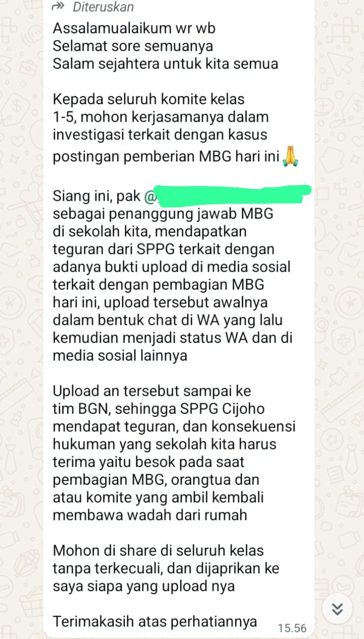 Siang ini, pak @******* sebagai penanggung jawab MBG di sekolah kita, mendapatkan teguran dari SPPG terkait dengan adanya bukti upload di media sosial terkait dengan pembagian MBG hari ini, upload tersebut awalnya dalam bentuk chat di WA yang lalu kemudian menjadi status WA dan di media sosial lainnya