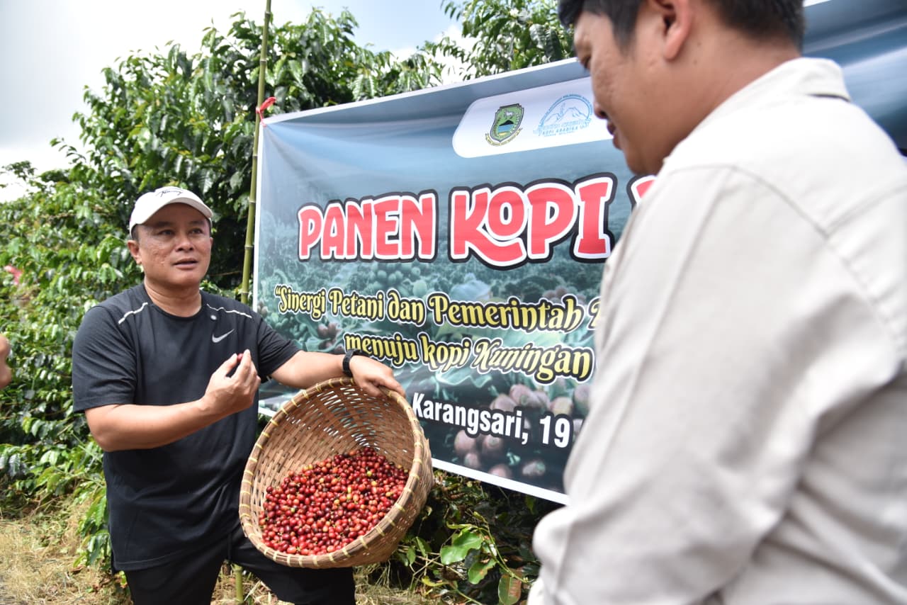 KUNINGANSATU.COM,- Pemerintah Kabupaten Kuningan semakin serius mengembangkan sektor pertanian berbasis komoditas unggulan, salah satunya kopi. Komitmen tersebut ditegaskan Bupati Kuningan, Dian Rachmat Yanuar, saat menghadiri kegiatan panen kopi bersama di Kebun Kopi Blok Pasir Batang, Desa Karangsari, Kecamatan Darma, Minggu (19/4/2026).