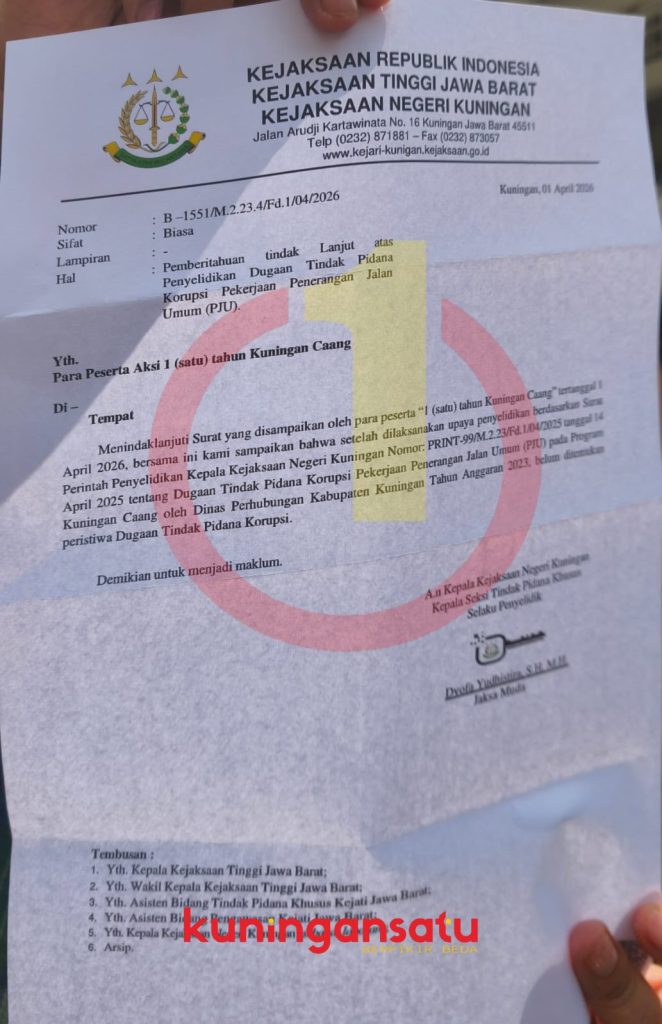 Dalam surat bernomor B-1551/M.2.23.4/Fd.1/04/2026, Kejari Kuningan menyampaikan bahwa hasil penyelidikan atas proyek penerangan jalan umum (PJU) pada program Kuningan Caang tidak menemukan adanya unsur tindak pidana korupsi. Proyek yang dikelola oleh Dinas Perhubungan Kabupaten Kuningan tersebut dinyatakan belum memenuhi indikasi pelanggaran hukum.