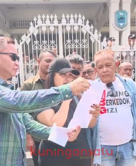 Penyerahan dokumen tersebut berlangsung di kawasan Pendopo Kabupaten Kuningan, setelah massa sebelumnya menggelar aksi unjuk rasa di kantor Kejari. Surat itu diterima oleh Ismah Winartono dan dibacakan di hadapan para peserta aksi.