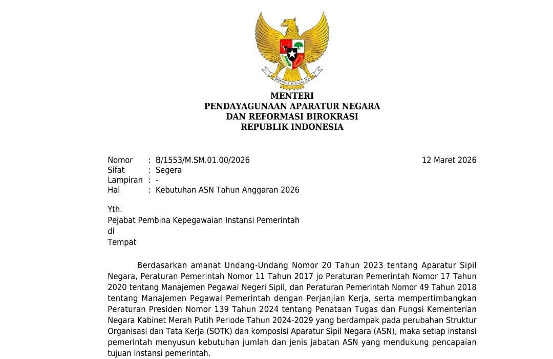 Kabar Baik! Pemerintah Siapkan Formasi ASN 2026, Instansi Diminta Segera Ajukan Kebutuhan