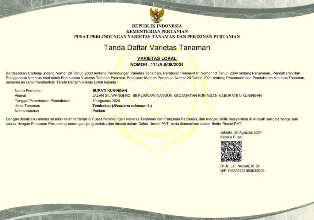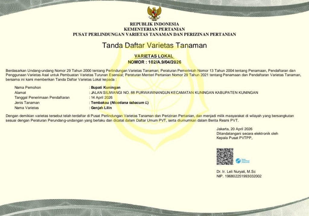 KUNINGANSATU.COM,- Kabupaten Kuningan terus menegaskan langkahnya dalam membangun sektor pertanian berbasis potensi lokal. Terbaru, dua varietas tembakau asal daerah ini resmi mengantongi pengakuan dari pemerintah pusat, menambah daftar varietas unggulan yang kini berstatus bersertifikat nasional menjadi empat.